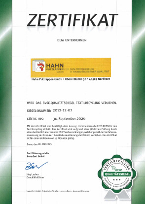 Damit ist die HAHN Putzlappen GmbH weiterhin als Entsorgungsfachbetrieb für Textilien zugelassen und qualifiziert. Außerdem wird durch das Qualitätssiegel bescheinigt, dass alle Richtlinien zum Textilrecycling eingehalten wurden und werden.